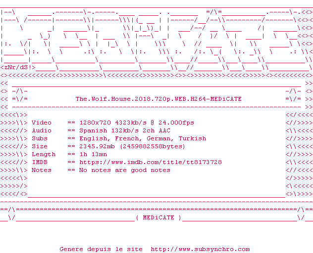 Voir le nfo de la release The.Wolf.House.2018.720p.WEB.H264-MEDiCATE