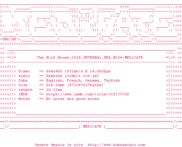 Voir le nfo de la release The.Wolf.House.2018.iNTERNAL.WEB.H264-MEDiCATE