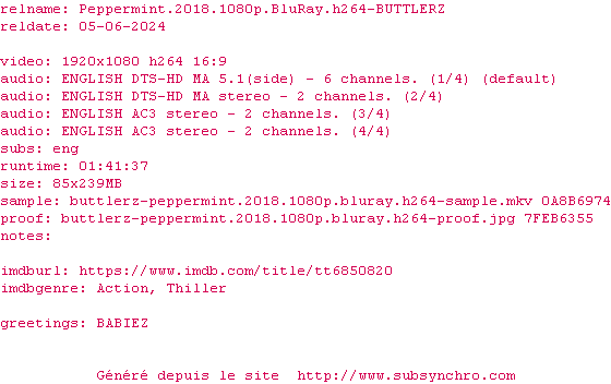 Voir le nfo de la release Peppermint.2018.1080p.BluRay.H264-BUTTLERZ