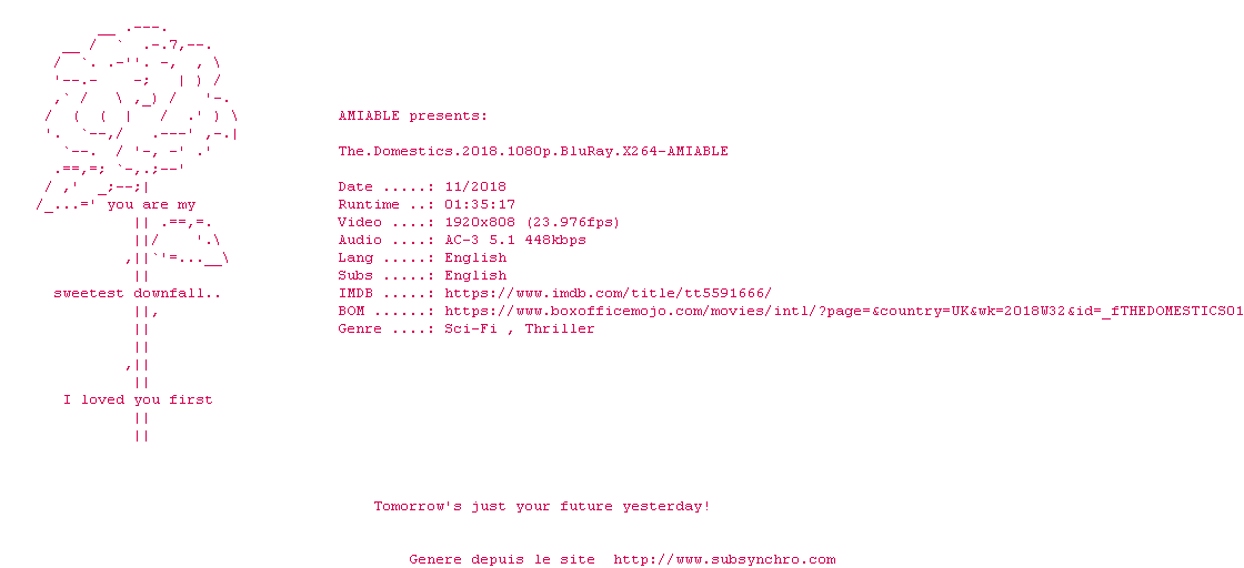 Voir le nfo de la release The.Domestics.2018.REPACK.BDRip.x264-AMIABLE