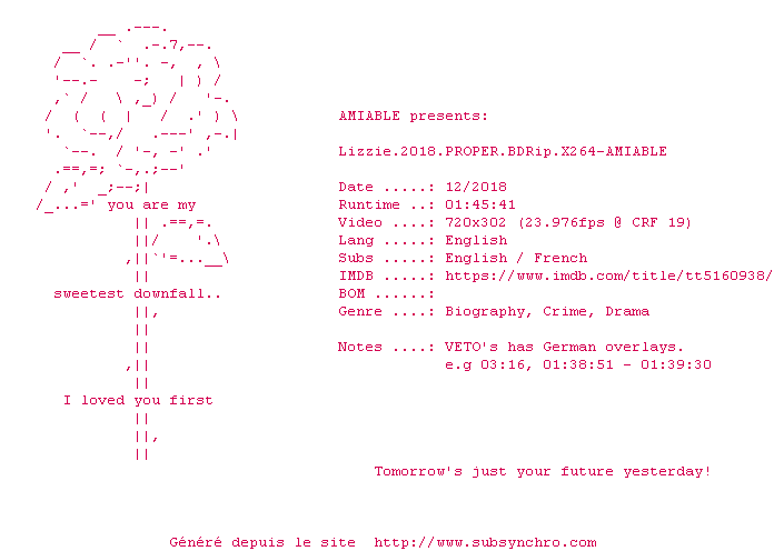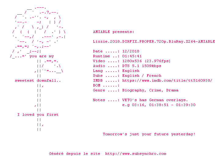 Voir le nfo de la release Lizzie.2018.PROPER.1080p.BluRay.x264-AMIABLE