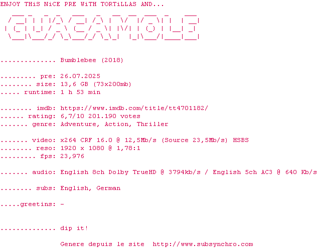 Y avez-vous pense ? Nous proposons déjà 1362 sous-titres pour le film Bumblebee. Avez-vous essaye de voir si ces sous-titres etaient compatibles avec cette release ? On vous laisse le soin de tester cela pour nous et de contribuer au site en postant le sous-titre en cas de compatiblite constatee !