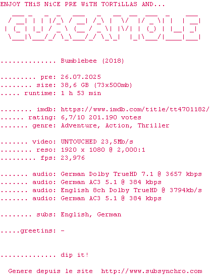 Y avez-vous pense ? Nous proposons déjà 1362 sous-titres pour le film Bumblebee. Avez-vous essaye de voir si ces sous-titres etaient compatibles avec cette release ? On vous laisse le soin de tester cela pour nous et de contribuer au site en postant le sous-titre en cas de compatiblite constatee !