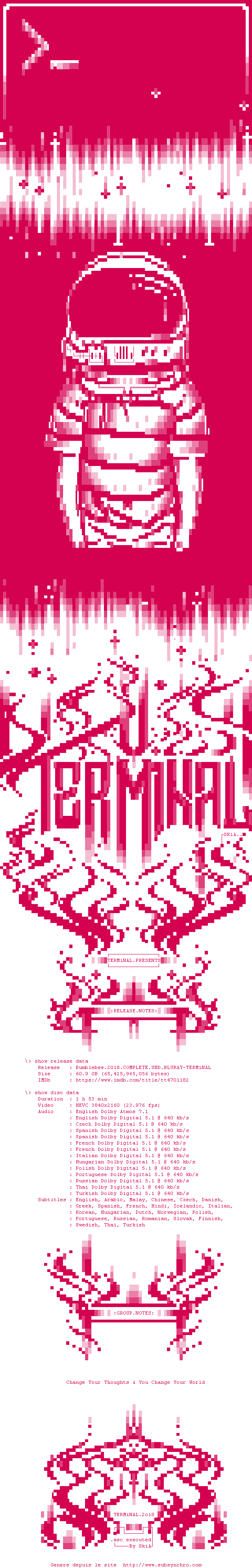 Y avez-vous pense ? Nous proposons déjà 1362 sous-titres pour le film Bumblebee. Avez-vous essaye de voir si ces sous-titres etaient compatibles avec cette release ? On vous laisse le soin de tester cela pour nous et de contribuer au site en postant le sous-titre en cas de compatiblite constatee !