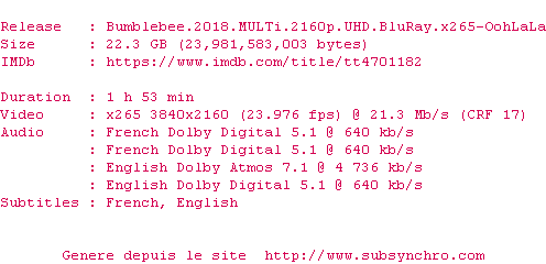 La release Bumblebee.2018.MULTi.2160p.UHD.BluRay.x265-OohLaLa est en 4K
