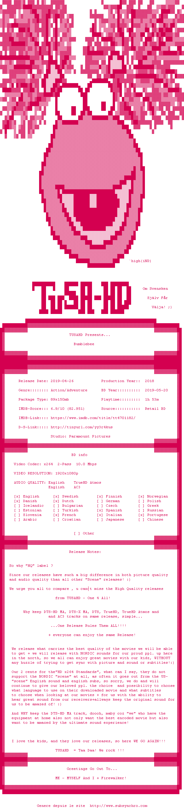 Y avez-vous pense ? Nous proposons déjà 1362 sous-titres pour le film Bumblebee. Avez-vous essaye de voir si ces sous-titres etaient compatibles avec cette release ? On vous laisse le soin de tester cela pour nous et de contribuer au site en postant le sous-titre en cas de compatiblite constatee !