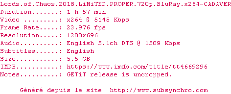 Voir le nfo de la release Lords.Of.Chaos.2018.LiMiTED.PROPER.720p.BluRay.x264-CADAVER
