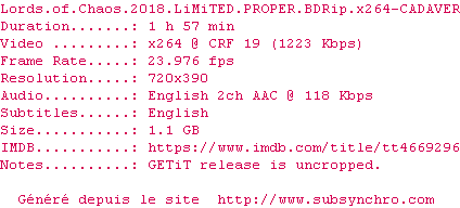 Voir le nfo de la release Lords.Of.Chaos.2018.LiMiTED.PROPER.BDRip.x264-CADAVER