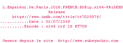 Voir le nfo de la release L.Empereur.De.Paris.2018.FRENCH.BDRip.x264-PRiDEHD