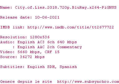 Y avez-vous pense ? Nous proposons déjà 2084 sous-titres pour le film City of Lies. Avez-vous essaye de voir si ces sous-titres etaient compatibles avec cette release ? On vous laisse le soin de tester cela pour nous et de contribuer au site en postant le sous-titre en cas de compatiblite constatee !