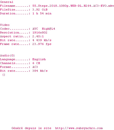 | Voir le nfo de la release 55.Steps.2018.1080p.WEB-DL.H264.AC3-EVO | EVO | 55.Steps.2018.1080p.WEB-DL.H264.AC3-EVO OpenSubtitles | 0 fichier | ||