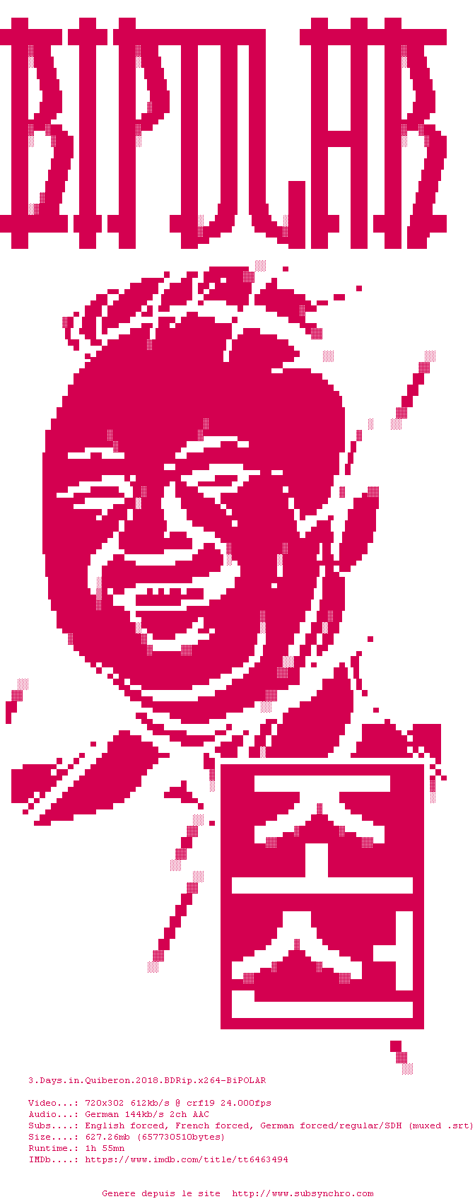 | Voir le nfo de la release 3.Days.In.Quiberon.2018.BDRip.x264-BiPOLAR | BiPOLAR | 3.Days.In.Quiberon.2018.BDRip.x264-BiPOLAR OpenSubtitles | 0 fichier | ||