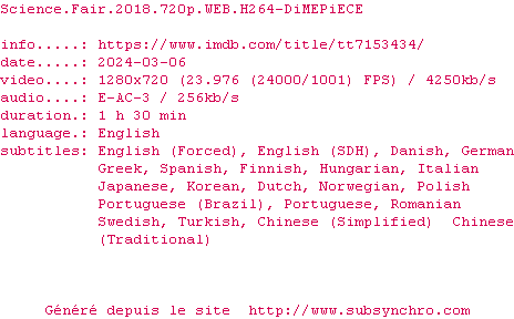 Voir le nfo de la release Science.Fair.2018.720p.WEB.H264-DiMEPiECE