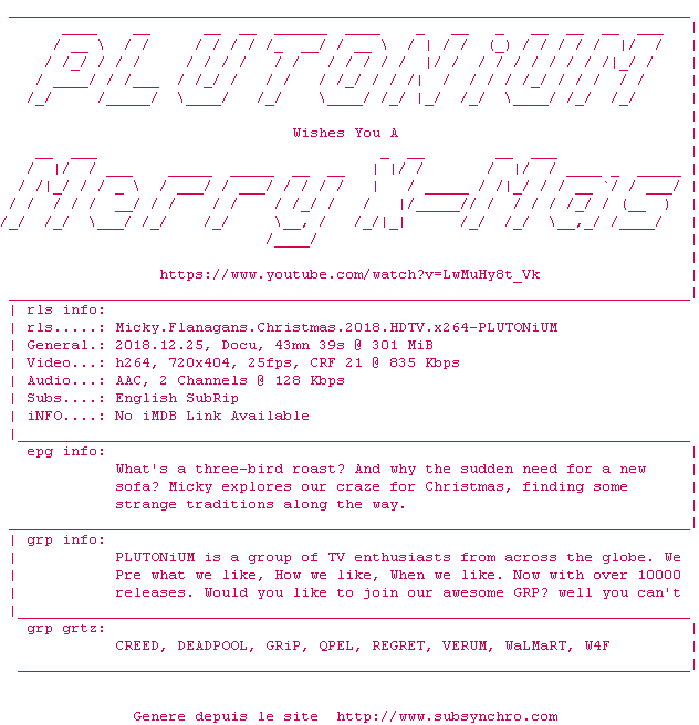 Voir le nfo de la release Micky.Flanagans.Christmas.2018.720p.HDTV.x264-PLUTONiUM