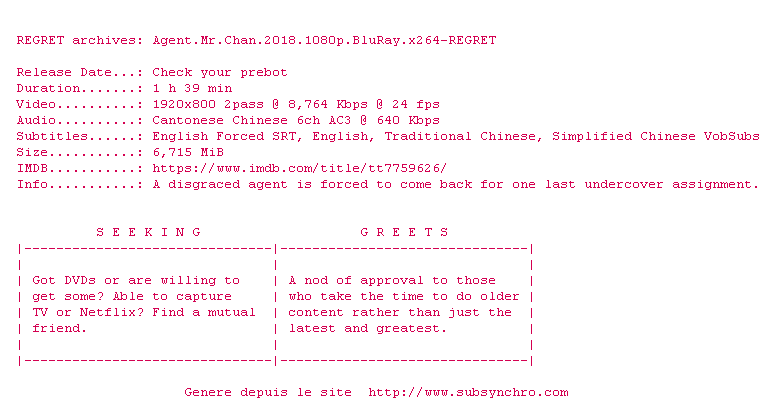 Y avez-vous pense ? Nous proposons déjà 1818 sous-titres pour le film Agent Mr Chan. Avez-vous essaye de voir si ces sous-titres etaient compatibles avec cette release ? On vous laisse le soin de tester cela pour nous et de contribuer au site en postant le sous-titre en cas de compatiblite constatee !