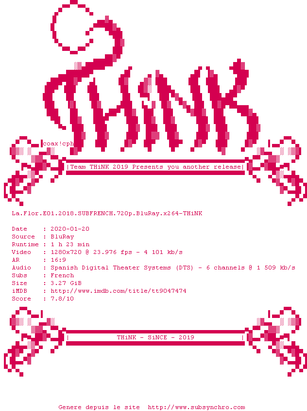 Y avez-vous pense ? Nous proposons déjà 1 sous-titre pour le film La Flor - Partie 1. Avez-vous essaye de voir si ces sous-titres etaient compatibles avec cette release ? On vous laisse le soin de tester cela pour nous et de contribuer au site en postant le sous-titre en cas de compatiblite constatee !