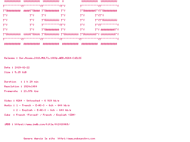 Our.House.2018.MULTi.1080p.WEB.H264-CiELOS.srt Ce fichier a été testé et validé par Hurukan Ajouté par Hurukan Ajoute le 15-11-2024 18:48:00 Format : SRT Italique : Non Taille : 0.00Ko Telechargement : 2 Testé par le membre Ajouter cette release à ma collection en cas de telechargement des sous-titres 0 0 0 Telecharger le ZiP contenant NFO, Affiche, Sous-titre (*.srt) Commentez le fichier Our.House.2018.MULTi.1080p.WEB.H264-CiELOS.srt Commentez le fichier Our.House.2018.MULTi.1080p.WEB.H264-CiELOS.srt Commentez ce fichier Le fichier 2642-1731692880.srt n'existe pas ! Telechargez le RSS « Fichier de la release Our.House.2018.MULTi.1080p.WEB.H264-CiELOS » Retour au film « Notre maison »
