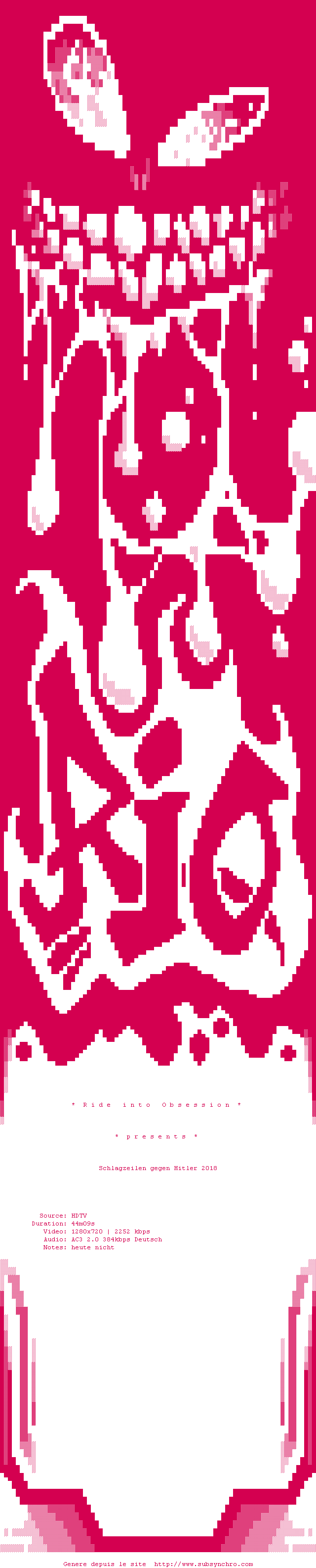 Y avez-vous pense ? Nous proposons déjà 1 sous-titre pour le film Schlagzeilen Gegen Hitler. Avez-vous essaye de voir si ces sous-titres etaient compatibles avec cette release ? On vous laisse le soin de tester cela pour nous et de contribuer au site en postant le sous-titre en cas de compatiblite constatee !