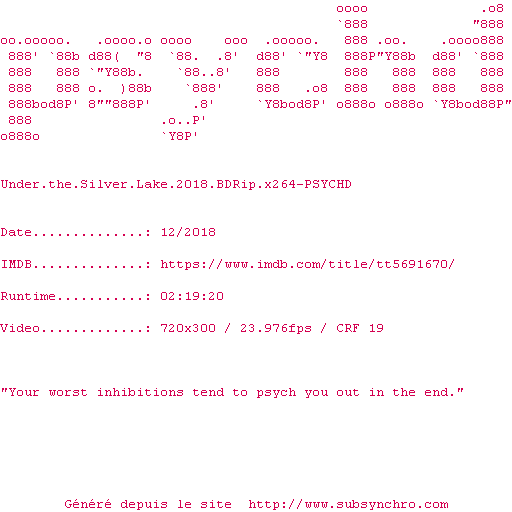 Under.the.Silver.Lake.2018.BDRip.x264-PSYCHD.srt Ajouté par Hurukan Ajoute le 11-06-2020 13:57:13 Format : SRT Italique : Oui Taille : 0.00Ko Telechargement : 25 Sous-titre Extrait d'un DVD Z2 Ajouter cette release à ma collection en cas de telechargement des sous-titres 0 0 0 Telecharger le ZiP contenant NFO, Affiche, Sous-titre (*.srt) Commentez le fichier Under.the.Silver.Lake.2018.BDRip.x264-PSYCHD.srt Commentez le fichier Under.the.Silver.Lake.2018.BDRip.x264-PSYCHD.srt Commentez ce fichier Le fichier 2642-1591876633.srt n'existe pas ! Telechargez le RSS « Fichier de la release Under.The.Silver.Lake.2018.BDRip.x264-PSYCHD » Retour au film « Under the Silver Lake »