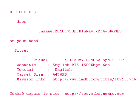 Telechargez le RSS « Fichier de la release Unsane.2018.720p.BluRay.x264-DRONES »