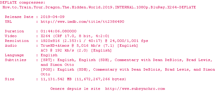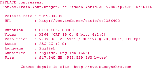 Le commentaire de SubSynchro Commente par SubSynchro (433), Le Mercredi 03 Avril 2019 à 10h38 Je l'ai vu au cinéma et encore une fois la saga Dragons nous ravi ! Harold devenu chef du village traverse toutes les émotions de la vie ! Prise de décision, engagement amoureux, libération d'un ami. Bref les enfants s'amusent et les parents prennent plaisir aussi à regarder le film autrement ! Bref, si vous avez aimé les 2 premiers celui ci ne peut que vous enchanter ! 9 / 10 2 0