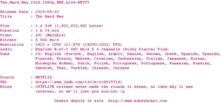 Voir le nfo de la release The.Hard.Way.2019.2160p.WEB.H265-BETTY