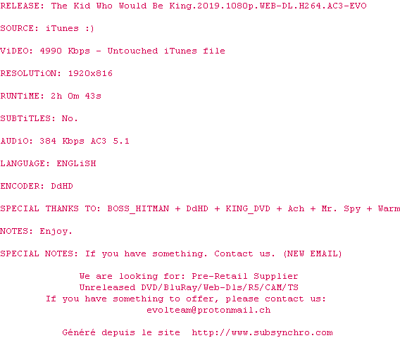 Voir le nfo de la release The.Kid.Who.Would.Be.King.2019.1080p.WEB-DL.H264.AC3-EVO