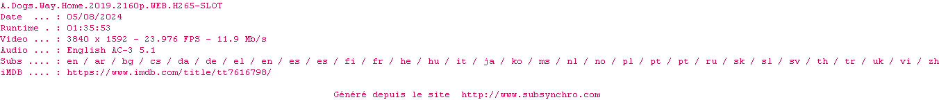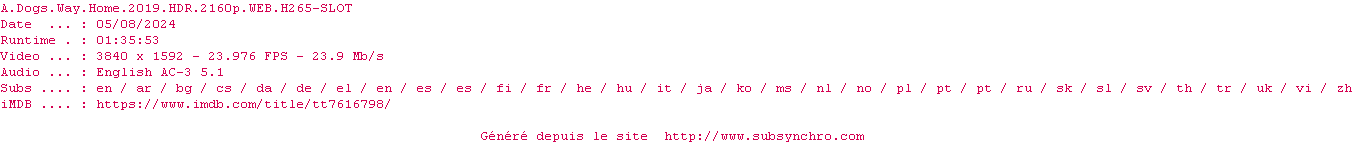 Voir le nfo de la release A.Dogs.Way.Home.2019.2160p.WEB.H265-SLOT