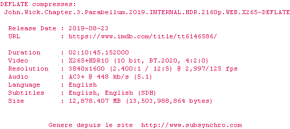 Le commentaire de txR Commente par txR (6), Le Mercredi 28 Aout 2019 à 22h34 Une vraie daube ! Pire qu'une production Netflix. Pour résumé, pendant 2h on regarde Keanu Reeves avec une blessure au ventre dégommer des gens au pistolet avec sa main droite et avec l'autre main il fait des prises de judo. 2 / 10 1 0