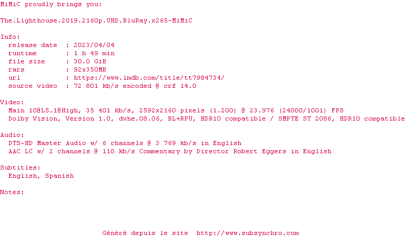 Voir le nfo de la release The.Lighthouse.2019.2160p.UHD.BluRay.x265-MiMiC