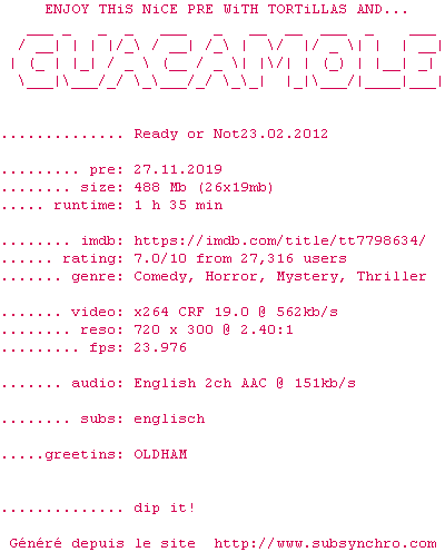 Voir le nfo de la release Ready.Or.Not.2019.720p.BluRay.x264-GUACAMOLE