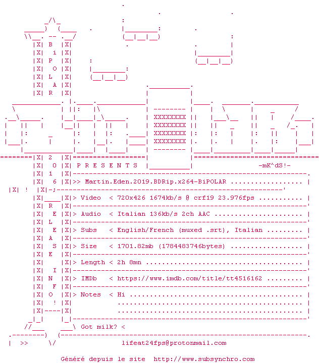Voir le nfo de la release Martin.Eden.2019.BDRip.x264-BiPOLAR