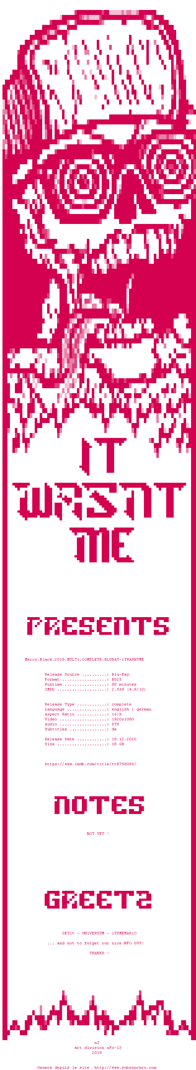 Y avez-vous pense ? Nous proposons déjà 1533 sous-titres pour le film Mercy Black. Avez-vous essaye de voir si ces sous-titres etaient compatibles avec cette release ? On vous laisse le soin de tester cela pour nous et de contribuer au site en postant le sous-titre en cas de compatiblite constatee !