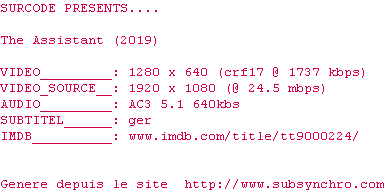 Voir le nfo de la release The.Assistant.2019.1080p.BluRay.x264-SURCODE