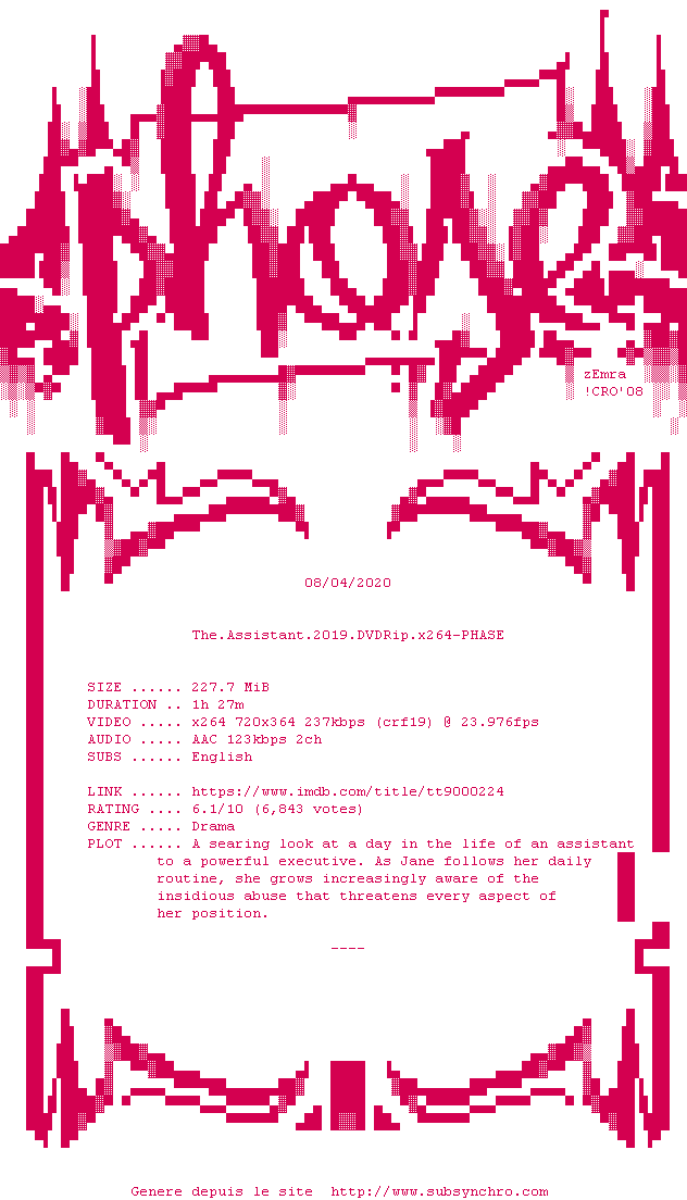 Voir le nfo de la release The.Assistant.2019.DVDRip.x264-PHASE