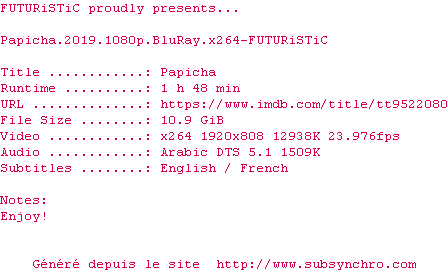 Voir le nfo de la release Papicha.2019.BDRip.x264-FUTURiSTiC