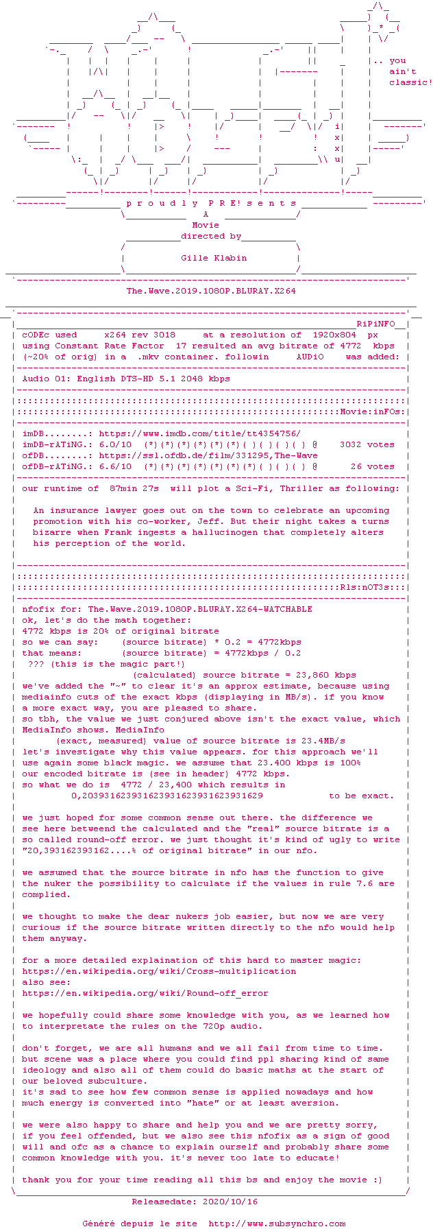 Voir le nfo de la release The.Wave.2019.1080P.BLURAY.x264.READNFO-WATCHABLE