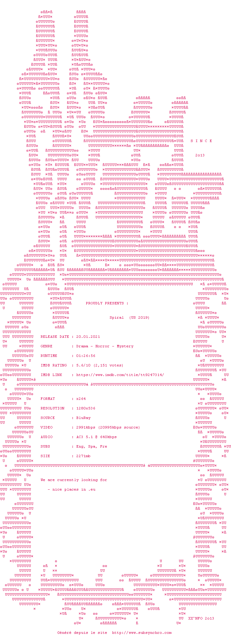 | Voir le nfo de la release Spiral.2019.720p.BluRay.x264-VETO | VETO | Spiral.2019.720p.BluRay.x264-VETO OpenSubtitles | 0 fichier |