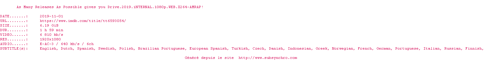 Voir le nfo de la release Drive.2019.iNTERNAL.1080p.WEB.x264-AMRAP