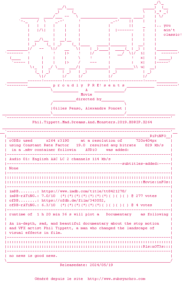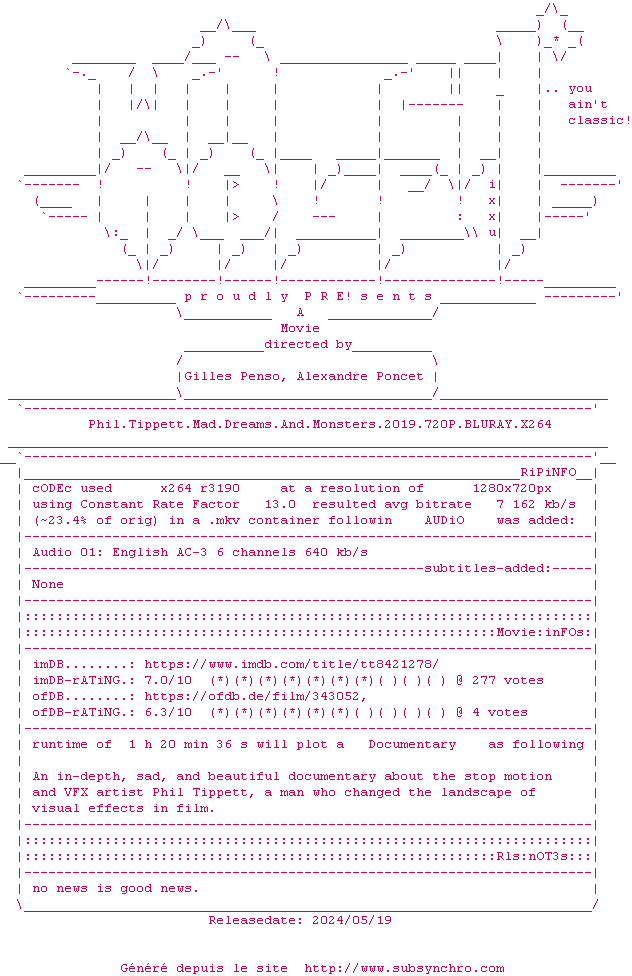 Voir le nfo de la release Phil.Tippett.Mad.Dreams.And.Monsters.2019.720P.BLURAY.x264-WATCHABLE