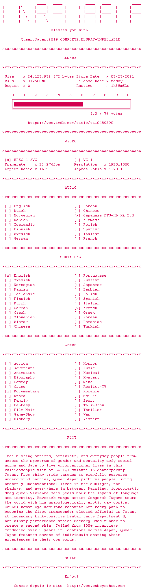 Des artistes, des militants et des personnes de tout genre et de toute sexualité défient les normes sociales et osent vivre des vies non conventionnelles dans cette vision kaléidoscopique de la culture LGBTQ+ dans le Japon contemporain.