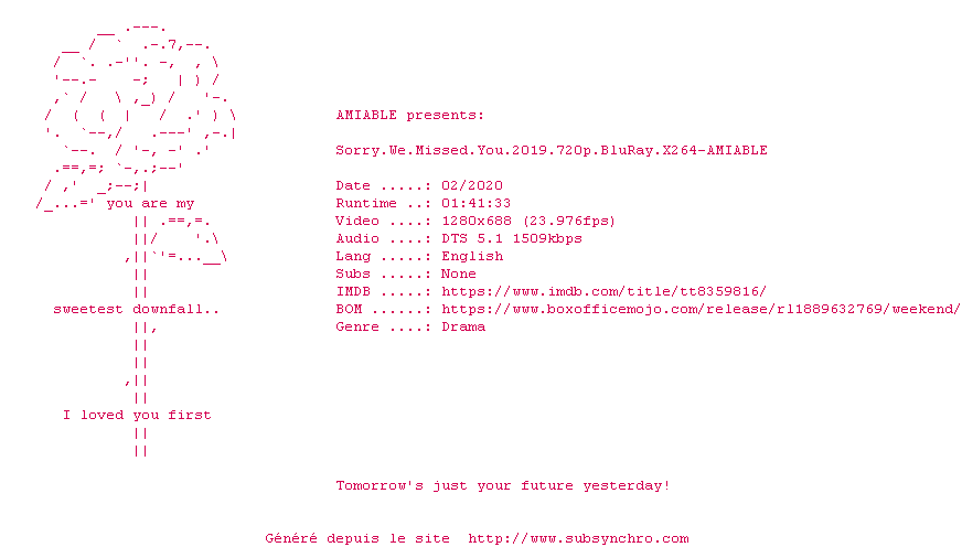 Sorry.We.Missed.You.2019.BDRip.X264-AMIABLE.srt Ajouté par Hurukan Ajoute le 23-02-2020 13:59:18 Format : SRT Italique : Oui Taille : 0.00Ko Telechargement : 63 Sous-titre Extrait d'un DVD Z2 Ajouter cette release à ma collection en cas de telechargement des sous-titres 0 0 0 Telecharger le ZiP contenant NFO, Affiche, Sous-titre (*.srt) Commentez le fichier Sorry.We.Missed.You.2019.BDRip.X264-AMIABLE.srt Commentez le fichier Sorry.We.Missed.You.2019.BDRip.X264-AMIABLE.srt Commentez ce fichier Le fichier 2642-1582462758.srt n'existe pas ! Telechargez le RSS « Fichier de la release Sorry.We.Missed.You.2019.720p.BluRay.x264-AMIABLE » Retour au film « Sorry We Missed You »
