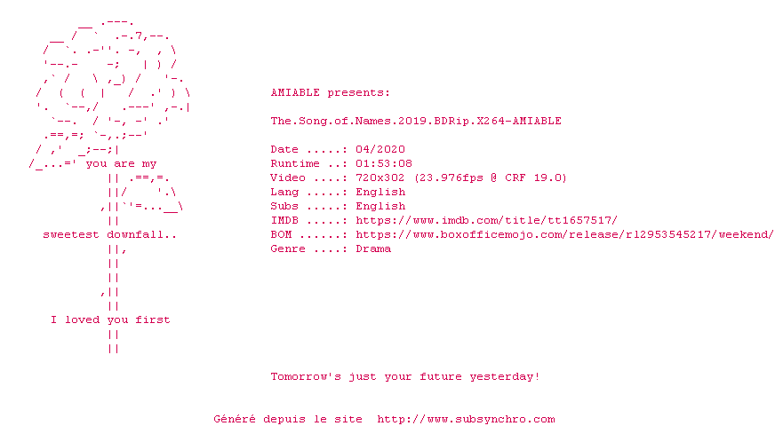 Telechargez le RSS « Fichier de la release The.Song.Of.Names.2019.BDRip.x264-AMIABLE »