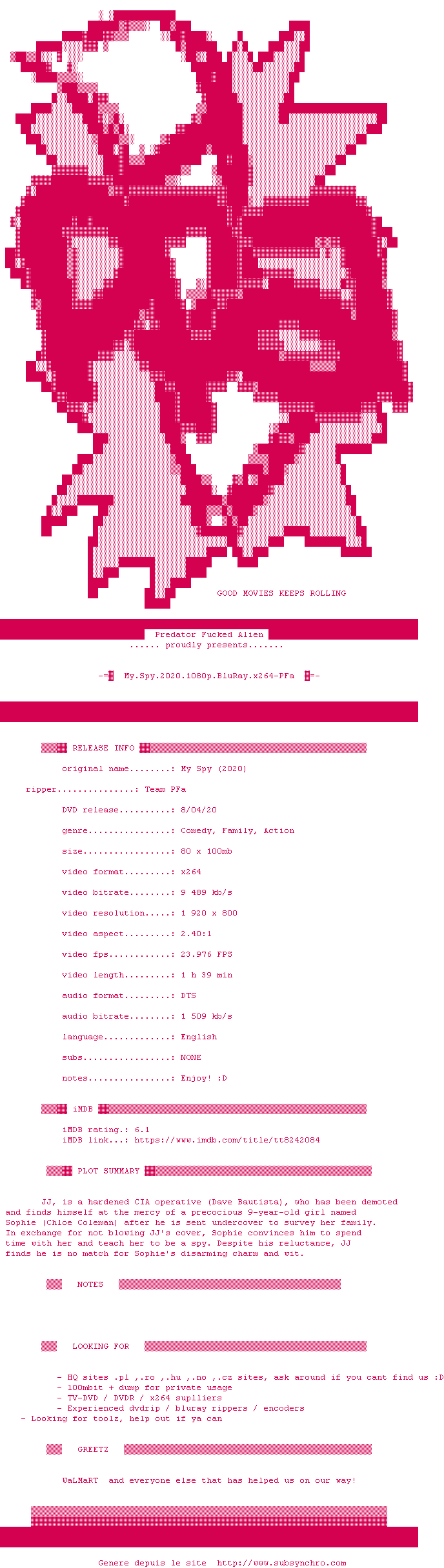 Voir le nfo de la release My.Spy.2020.1080p.BluRay.x264-PFa