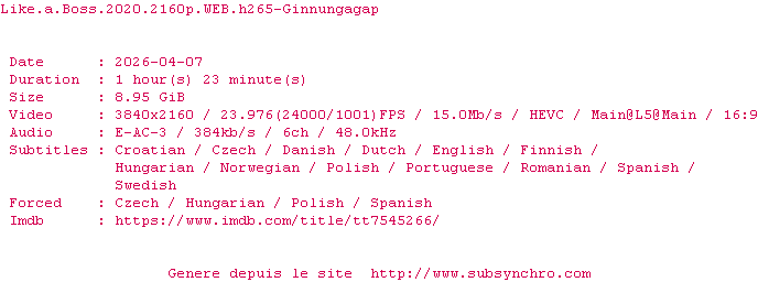 Y avez-vous pense ? Nous proposons déjà 1508 sous-titres pour le film Like a Boss. Avez-vous essaye de voir si ces sous-titres etaient compatibles avec cette release ? On vous laisse le soin de tester cela pour nous et de contribuer au site en postant le sous-titre en cas de compatiblite constatee !