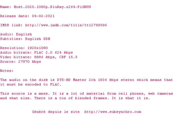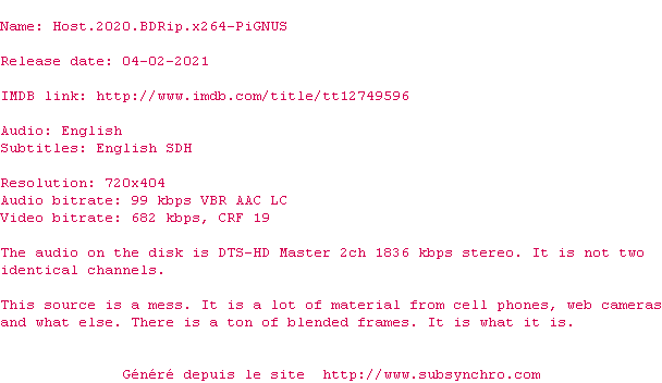 Voir le nfo de la release Host.2020.1080p.BluRay.x264-PiGNUS