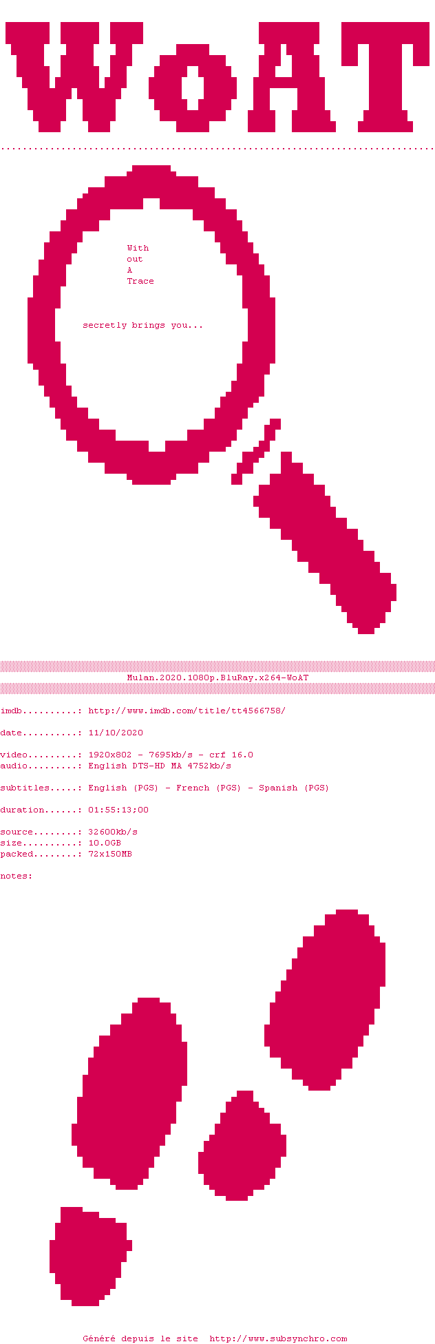 Voir le nfo de la release Mulan.2020.1080p.BluRay.x264-WoAT