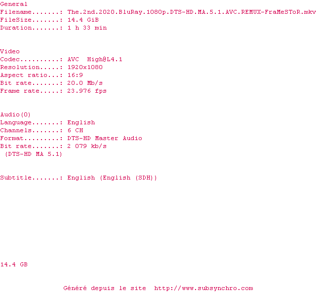 | Voir le nfo de la release The.2nd.2020.BluRay.1080p.DTS-HD.MA.5.1.AVC.REMUX-FraMeSToR | FraMeSToR | The.2nd.2020.BluRay.1080p.DTS-HD.MA.5.1.AVC.REMUX-FraMeSToR OpenSubtitles | 0 fichier |