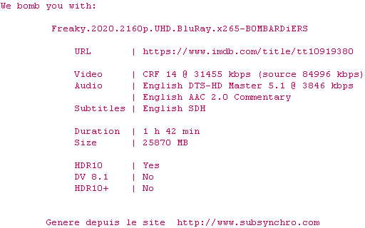 Voir le nfo de la release Freaky.2020.2160p.UHD.BluRay.x265-B0MBARDiERS