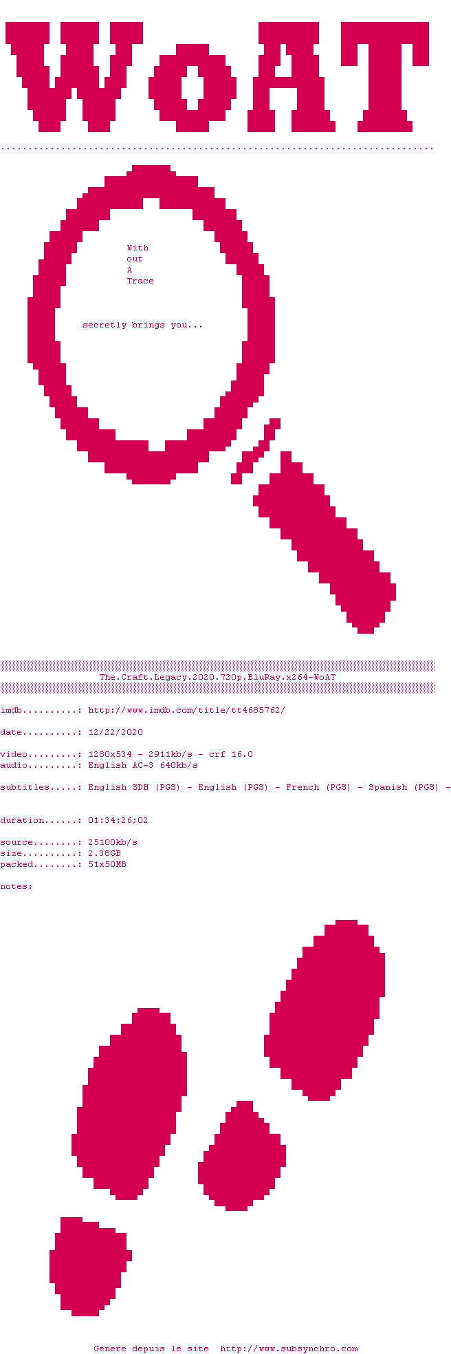 Voir le nfo de la release The.Craft.Legacy.2020.720p.BluRay.x264-WoAT